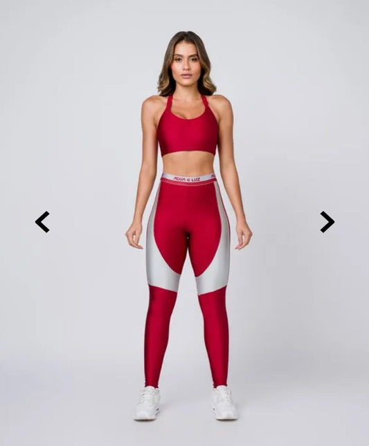 Calça poliamida carmim com recorte prata metalizado e elástico personalizado